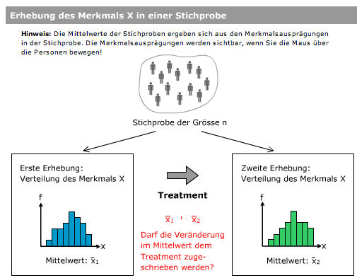 Da man sich in Untersuchungsdesigns mit Messwiederholung für die Auswirkung des Treatments auf das erhobene Merkmal X interessiert, muss geklärt werden, ob der Unterschied zwischen den beiden Mittelwerten so gravierend ist, dass bei der Interpretation des Unterschieds der Zufall ausgeschlossen werden kann.