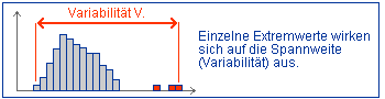 Die Spannweite kann einfach und rasch berechnet werden. Sie kann jedoch durch das Vorhandensein von einzelnen Extremwerten, die für die Verteilung nicht repräsentativ sind, leicht verzerrt werden. Einzelne Extremwerte an den beiden Enden einer Datenreihe können die Spannweite nämlich erheblich vergrössern und mehr Variabilität suggerieren als tatsächlich vorhanden ist. Die Variabilität gibt aber lediglich die Länge des Streubereichs an und beschreibt nicht, wie die einzelnen Beobachtungen in diesem Bereich streuen.